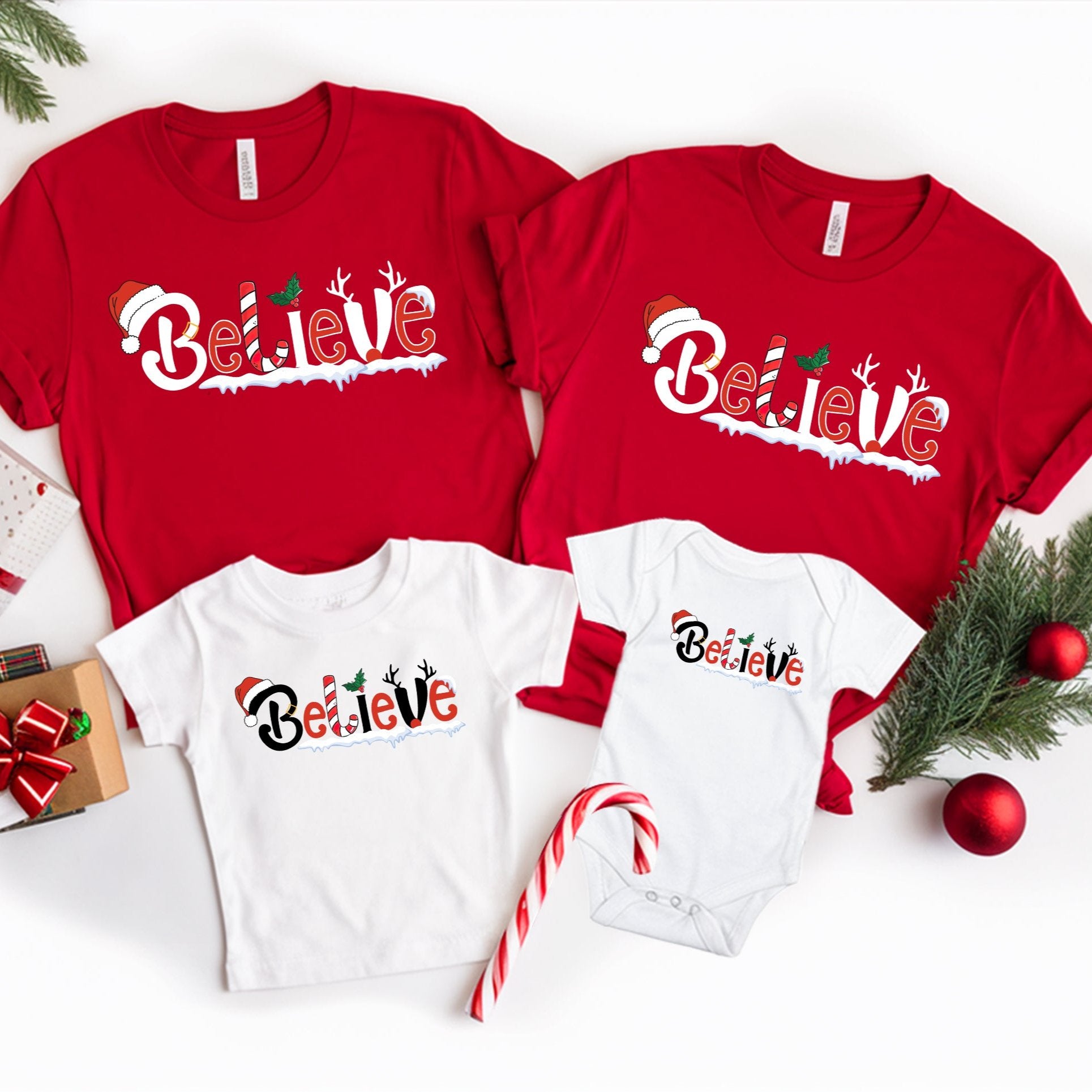 Get into the festive spirit with our "Believe" Christmas matching shirts, perfect for family holiday celebrations. These holiday shirts are designed to bring your family together with style and joy during the most wonderful time of the year!