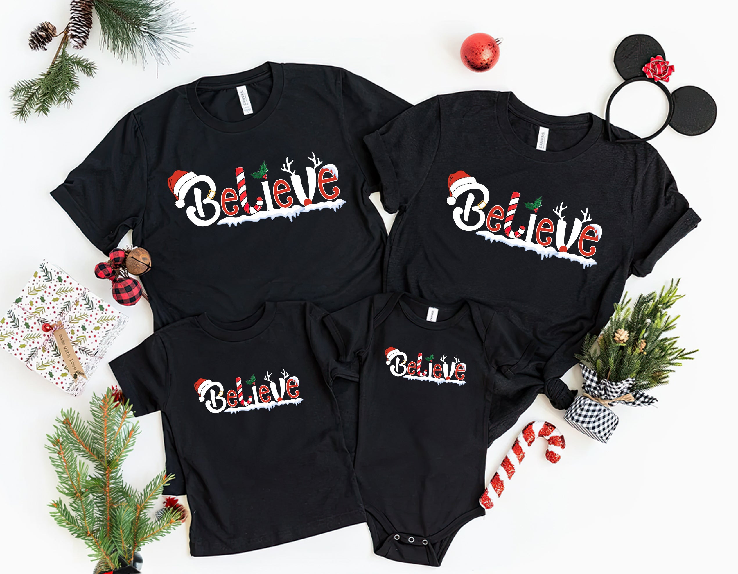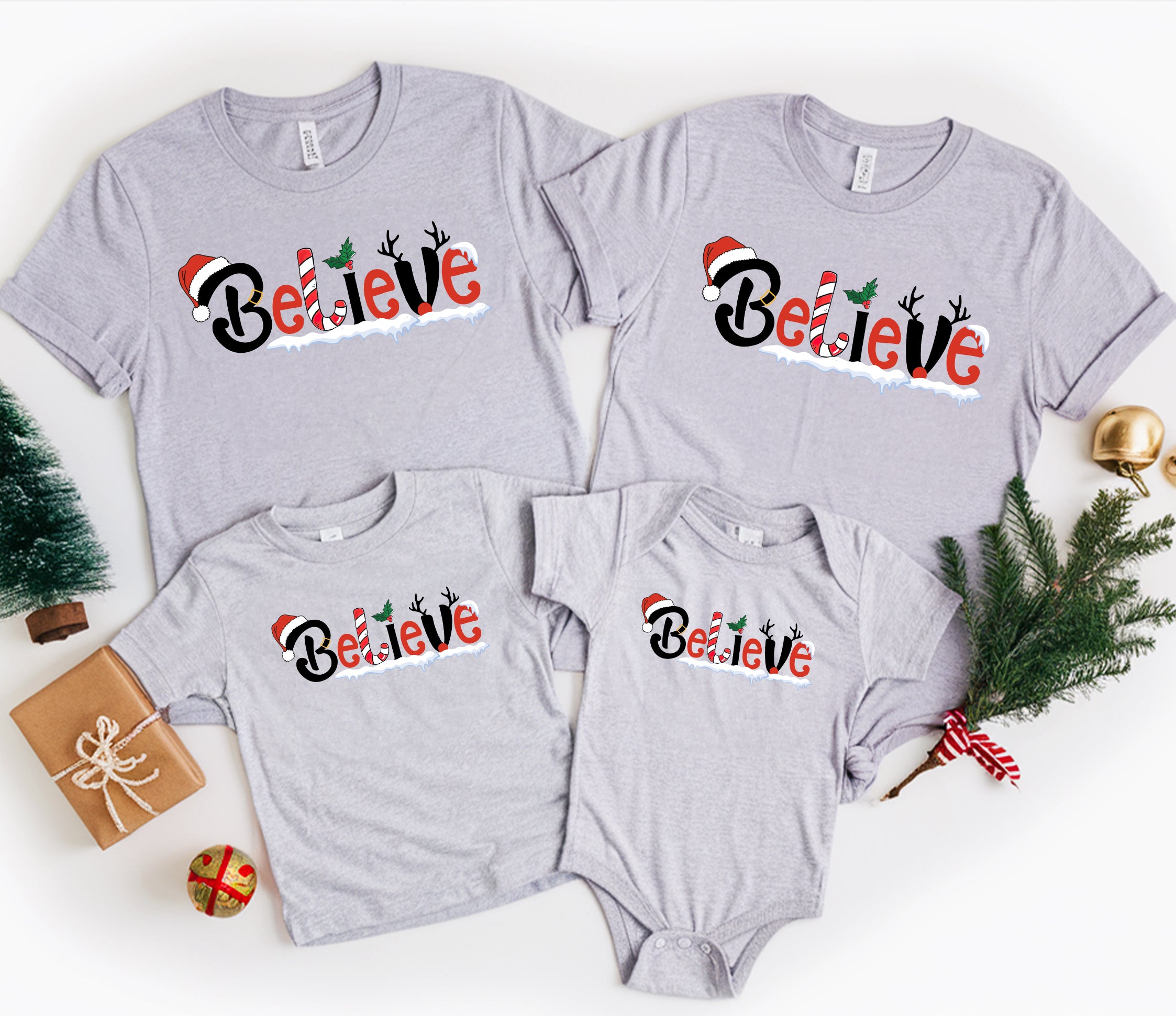 The magic of Christmas isn’t in the presents, it’s in the moments! Elevate your holiday cheer with our "Believe" matching family shirts and watch the season sparkle brighter.