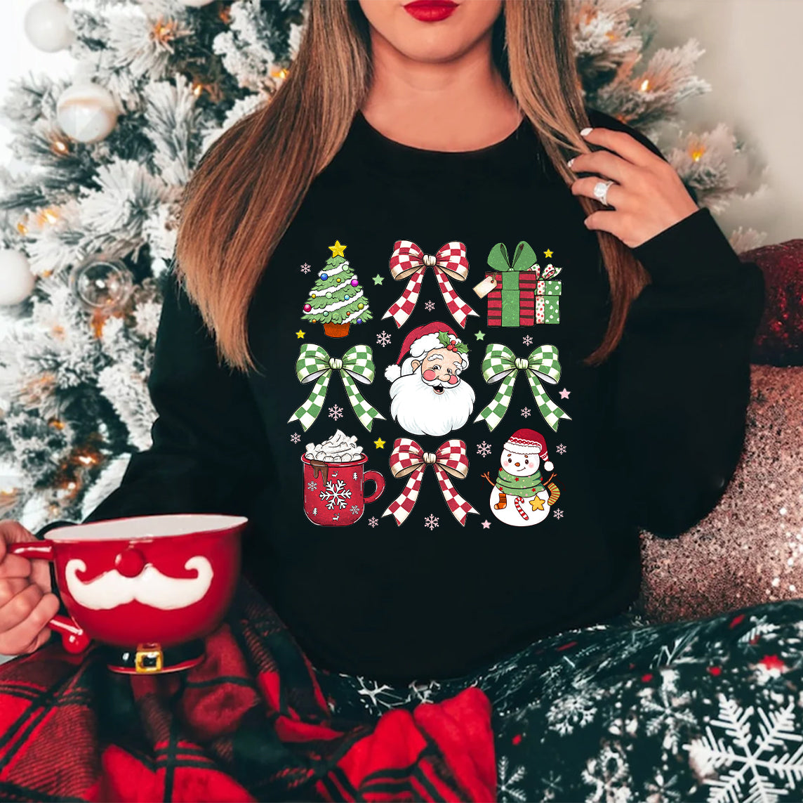 • Picture yourself basking in the glow of twinkling lights while wearing our Christmas Bow Sweatshirt or Holiday Sweatshirt. These designs are crafted to elevate your festive spirit and keep you snug during all your holiday festivities.