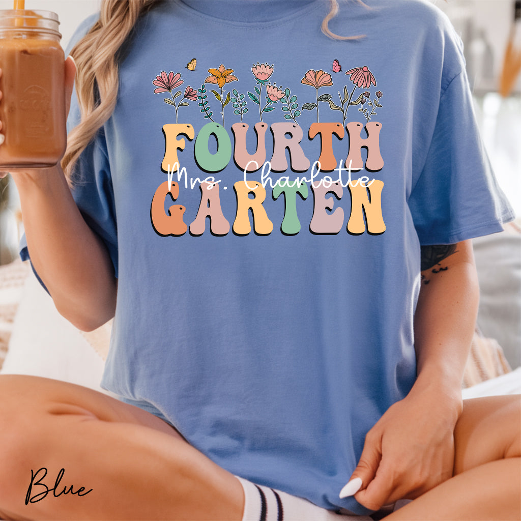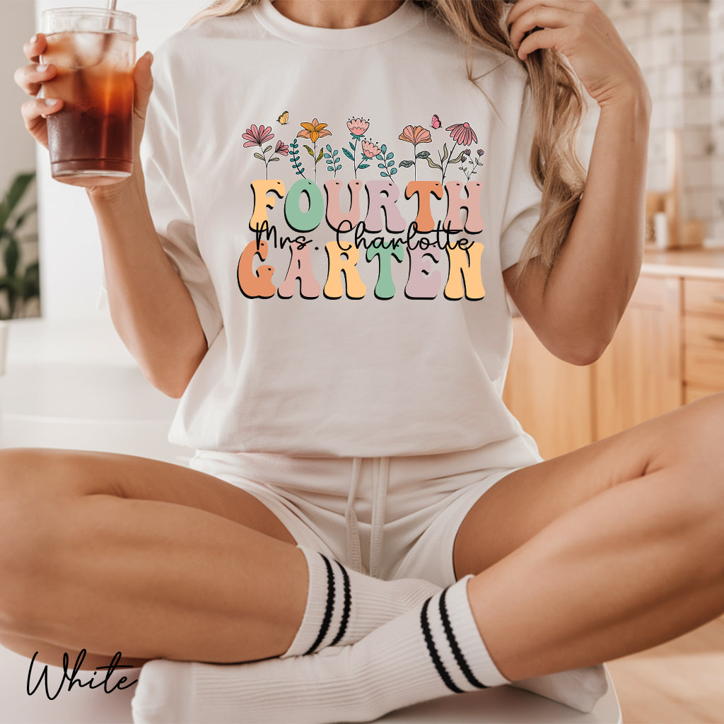 Discover the Comfort Colors Fourth Grade Teacher Shirt adorned with retro flower designs. Customize it with your name for a unique touch, perfect for any 4th-grade teacher.