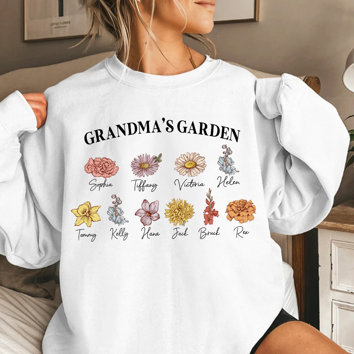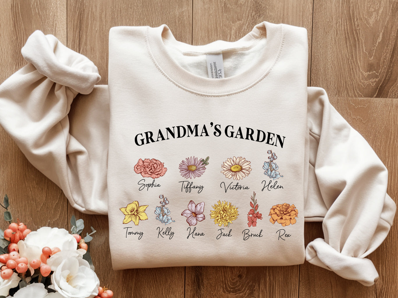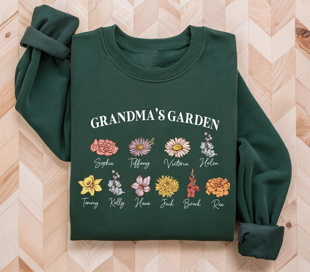 Imagine her face lighting up as she unwraps a sweatshirt that’s not just cozy but also brimming with personalized warmth. Each flower tells a story, each name a testament to her cherished role as the family's beloved matriarch.