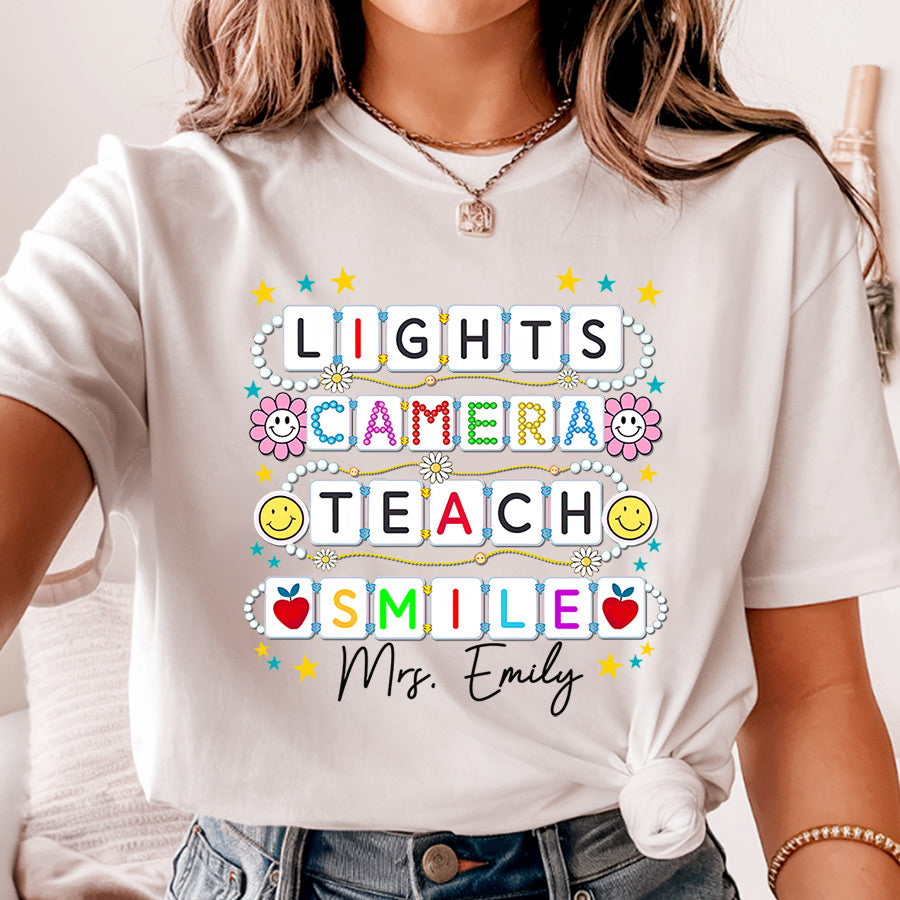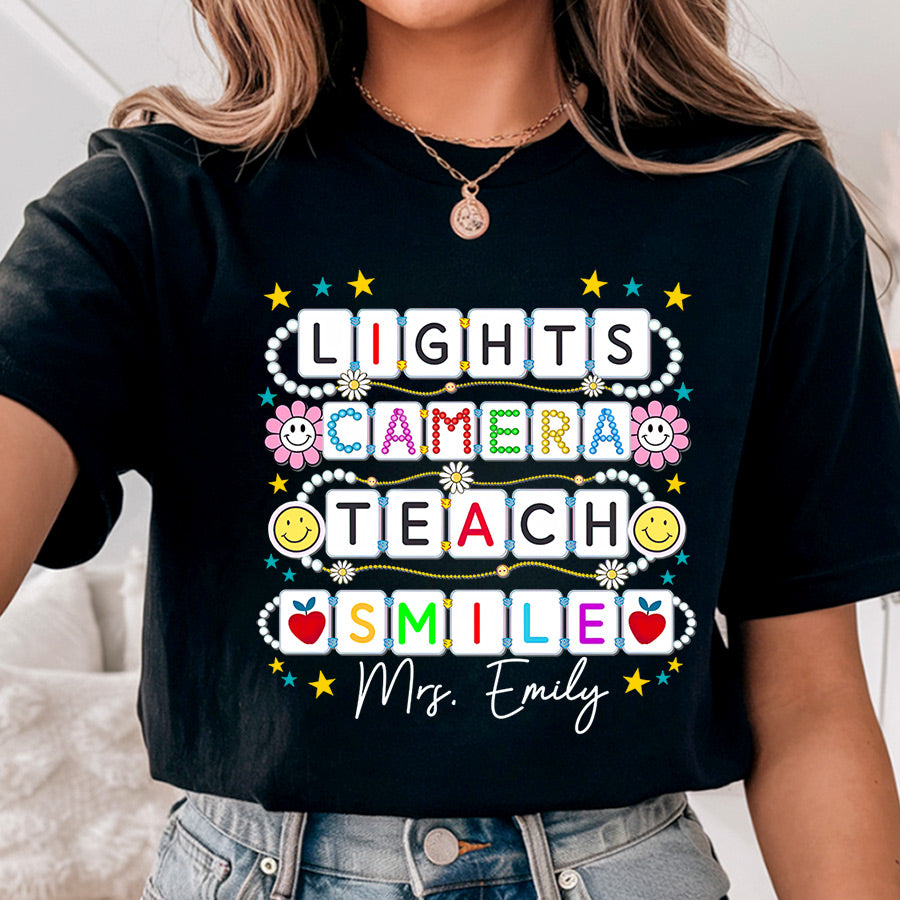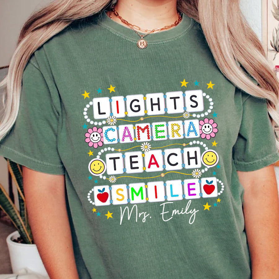 Capture the magic of the first day with our “Light, Camera, Teach, Smile” Comfort Colors shirt, featuring your name for a personalized touch. Pair it with our Teacher Friendship Bracelet Shirt for a charming ensemble that celebrates both new beginnings and cherished connections.