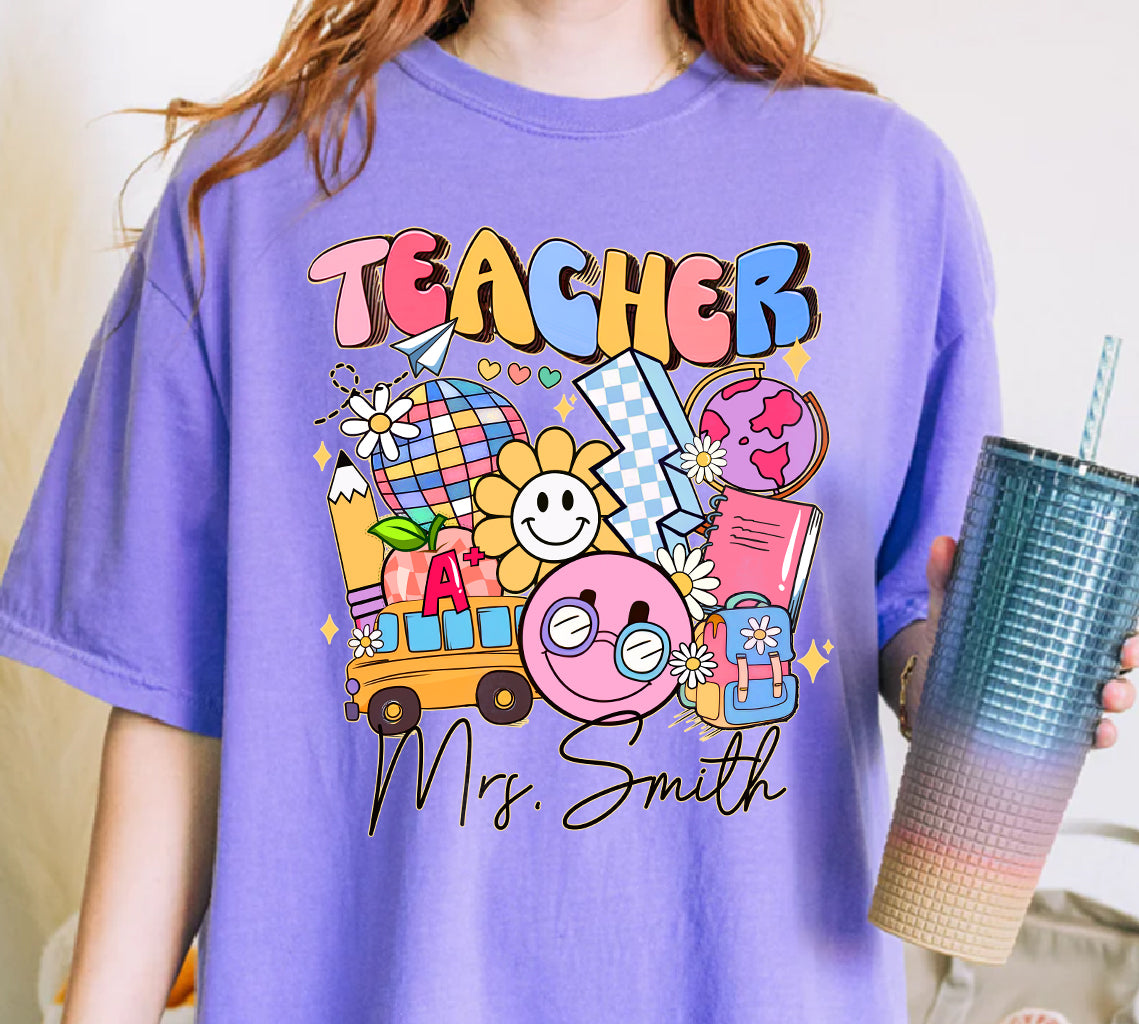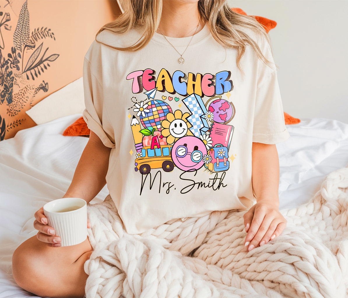 Discover the perfect blend of nostalgia and personalization with our personalized retro teacher name shirt. Whether you're shopping for yourself or seeking a thoughtful gift for a teacher, our cute back-to-school shirt is the ideal choice. Embrace style and sentimentality – shop now and make this school year unforgettable!