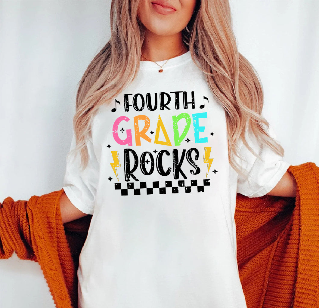 Retro Fourth Grade Rocks Shirt" celebrates fourth grade with style, perfect for teachers and students alike. Whether it's back-to-school or showing school spirit, this shirt is ideal for fourth-grade enthusiasts.