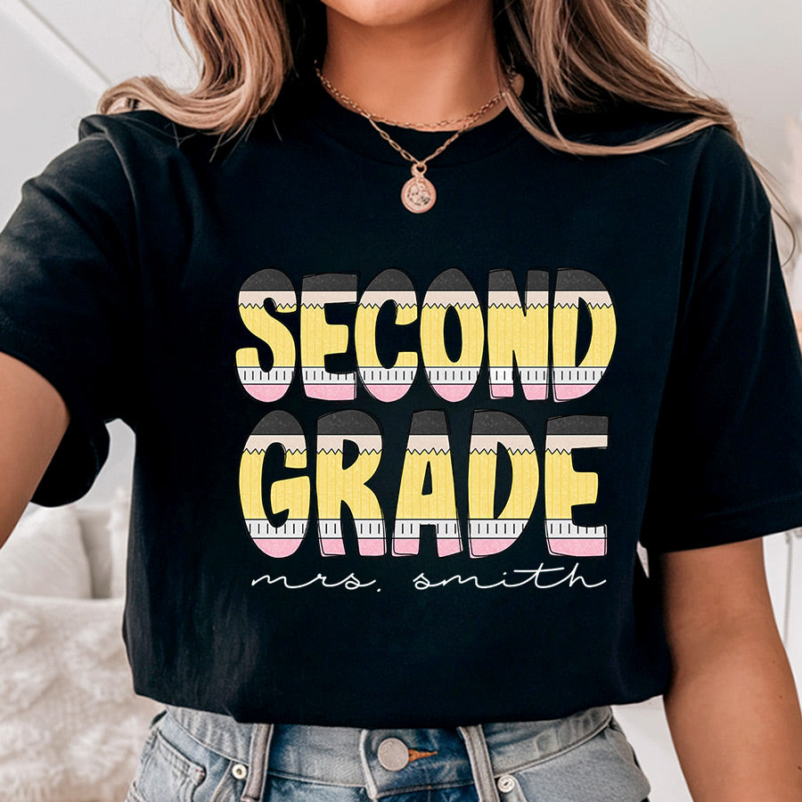 Celebrate your second-grade teaching team with a personalized Comfort Colors shirt featuring your custom name on a fun pencil design. This custom teacher shirt is perfect for showing off your 2nd grade pride in style!