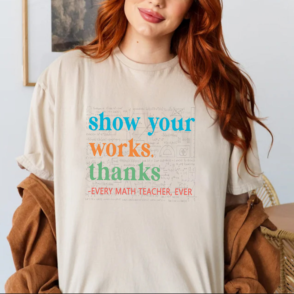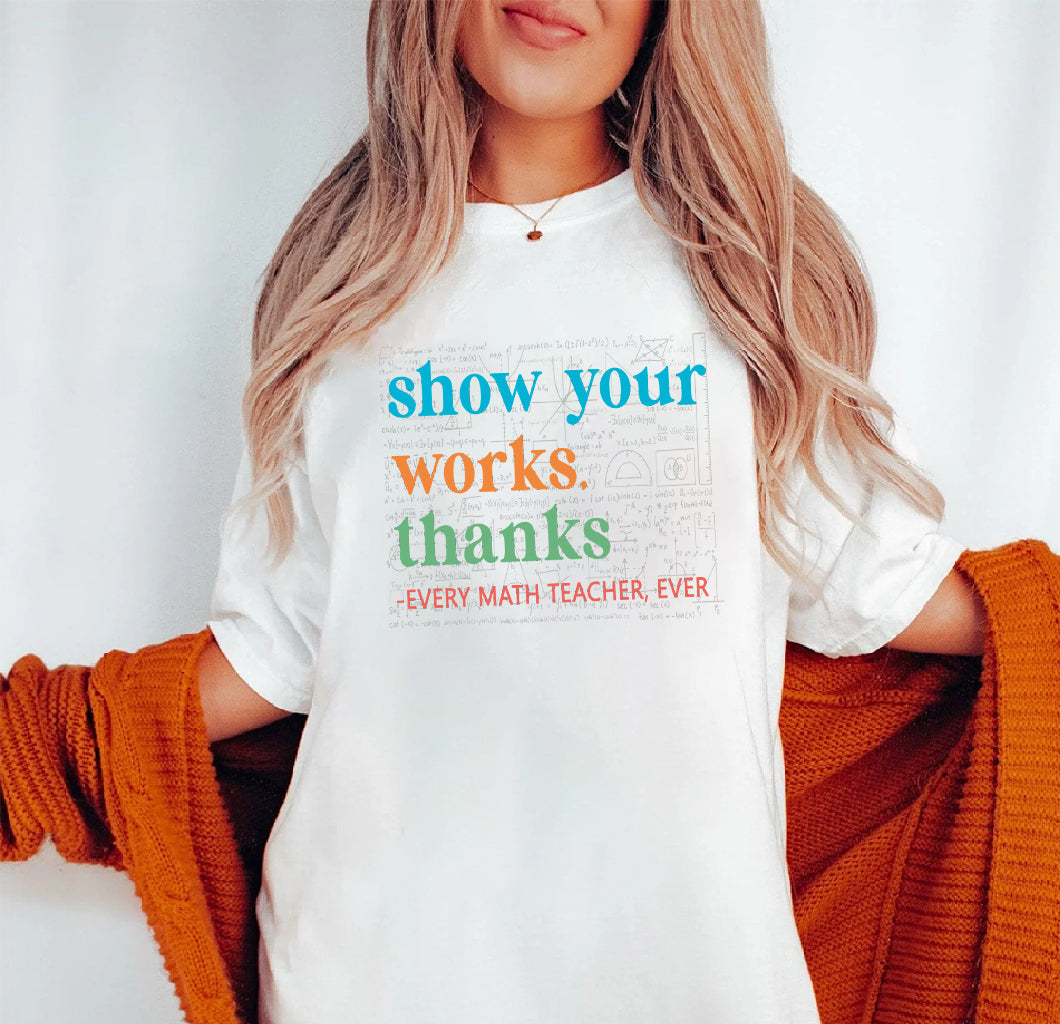 Grab your 'Show Your Work Thanks Teacher' T-shirt today! Perfect for math lovers and a great gift for your favorite math teacher. Show your appreciation with style!
