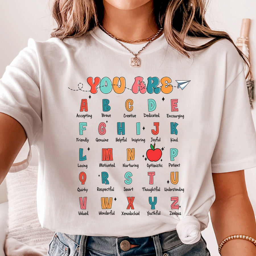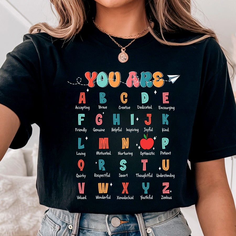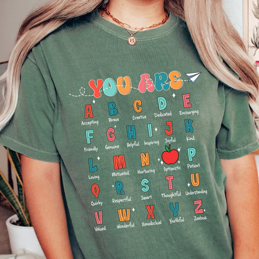 Celebrate your love for teaching with our "You Are Alphabet Teacher Shirt"! This Comfort Colors tee, perfect for Kindergarten teachers, combines ABC affirmation with style to brighten your classroom and inspire your students.